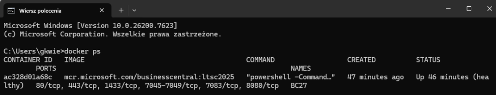 Zazwyczaj port 7048 kontenera jest otwarty od momentu utworzenia kontenera, co można zweryfikować wykonując polecenie: